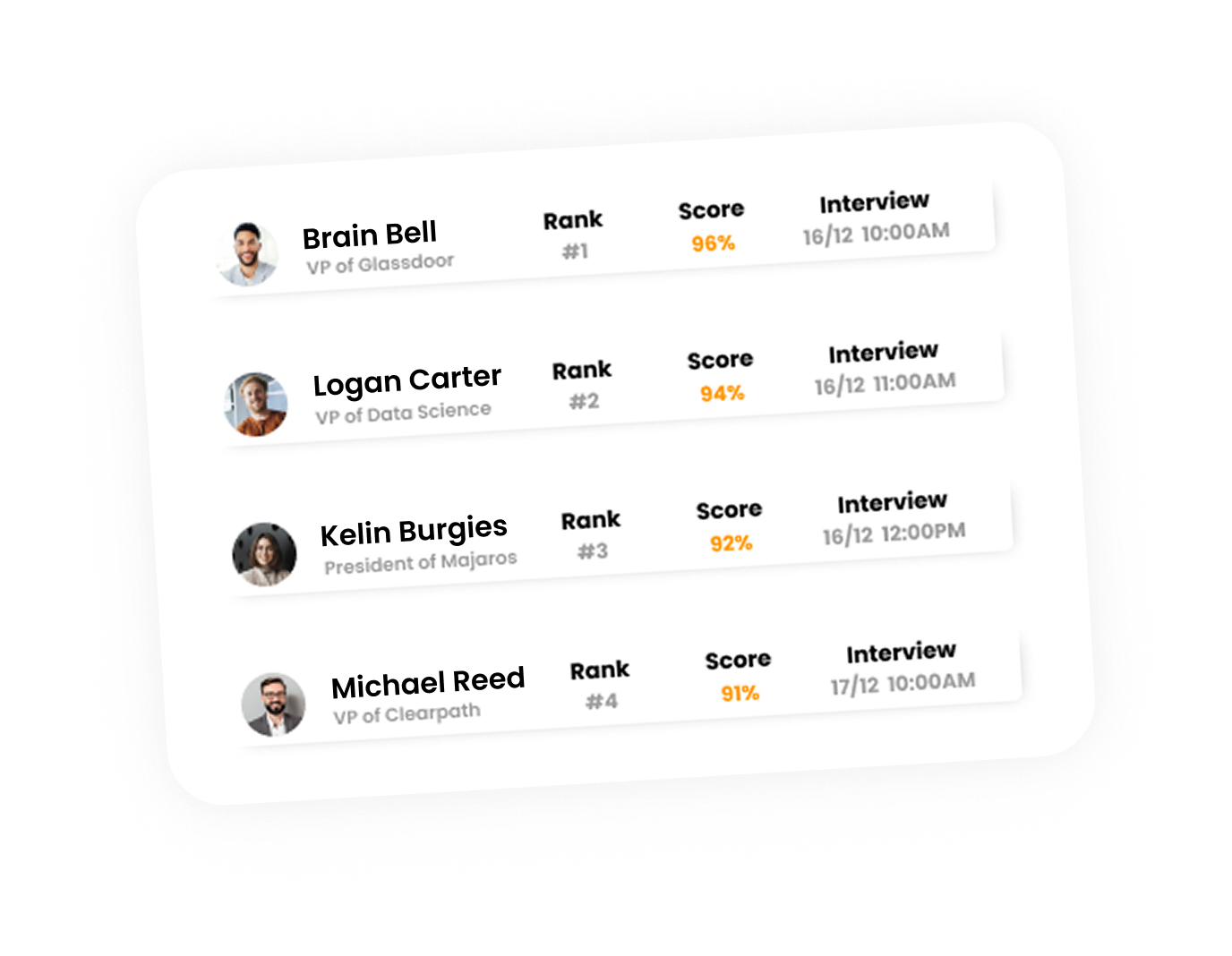 AI-sourced talent across LinkedIn, job boards, and internal CRM.