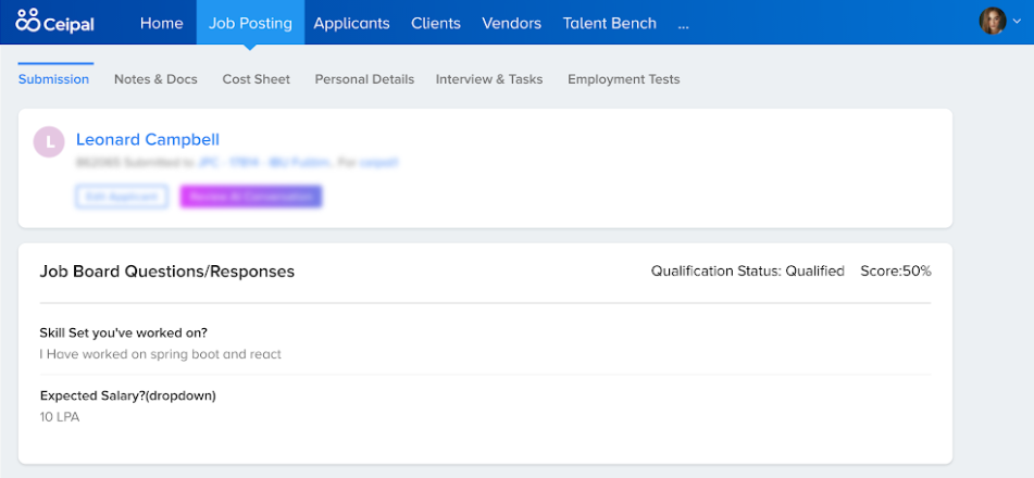 Ceipal ATS has been integrated with Apollo.io, and allows teams to enrich leads, clients, or applicants within the platform.