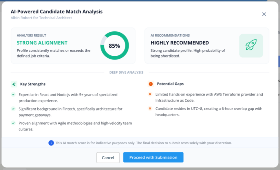 Before every submission, Ceipal's AI scores candidates against job requirements, evaluating skills, experience, financial fit, and availability. Your team submits with confidence, backed by data.